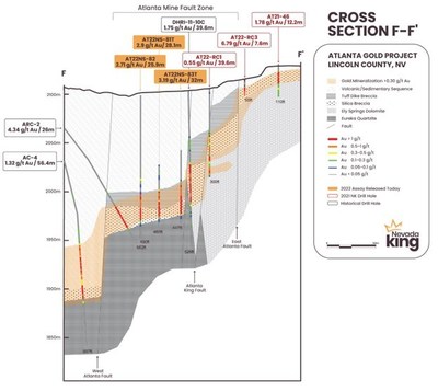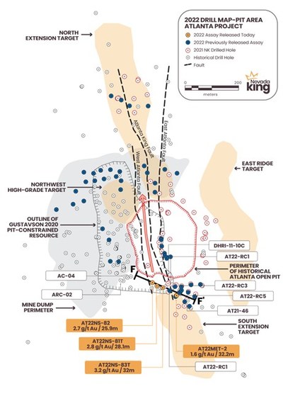 | Detailed Discussion The AKF is a major basement fault juxtaposing Eureka Quartzite on the west against Ely Springs Dolomite on the east. The dolomite stratigraphically overlies the quartzite, which means the eastern block has been significantly downdropped hundreds of meters. The mineralized Tertiary-age volcanic sequence unconformably overlies both the Paleozoic-age quartzite and dolomite, so the vertical displacement seen across the AKF pre-dates Tertiary-age caldera formation and later gold mineralization. However, the close spatial association of higher gold grades with phreatomagmatic explosive activity and banded quartz veining seen in holes proximal to the AKF strongly point to this major basement structure as being the main conduit (or feeder structure) for the shallow sub-volcanic intrusive bodies and coeval gold mineralization. As such, this feeder structure may well be the key to unlocking the high-grade potential at Atlanta. It appears to occupy the central axis of the AMFZ, so the Company has realigned its drilling pattern to concentrate along the NNW strike of this 70m wide zone in order to better define strike, dip, width, and gold grade distribution.The WAF is another major fault where the mineralization and quartzite block have been down-dropped 70m on the west side. Historical holes and Nevada King's recent holes across this down-dropped block show the silica breccia zone on top of the quartzite to be thinning westward, while the bulk of gold mineralization occurs in volcanic and volcaniclastic rocks above the silica breccia, unlike the mineralization further eastward that is largely hosted in the silica breccia zone. This fault also appears to be an important feeder structure, so the Company has dedicated one drill for following it along strike. Historical drill data suggest the fault extends 750m northward into the NET (Figure 1). Hole AT22MET-2 is a twin hole of vertical RC hole AT22-RC5 and was drilled primarily for metallurgical testing but also checked the validity of the Company's RC drilling. AT22MET-2 returned 32.2m grading 1.57 g/t Au while 22-RC5 hit 35.1m averaging 1.57 g/t Au. These results are very close, confirming good RC sample recovery and no evidence of down-hole contamination. Qualified Person The scientific and technical information in this news release has been reviewed and approved by Calvin R. Herron, P.Geo., who is a Qualified Person as defined by National Instrument 43-101 ("NI 43-101").