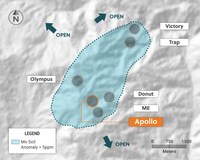The Apollo target area, as defined to date by surface mapping, rock sampling and copper and molybdenum soil geochemistry, covers an 800 metres X 700 metres area. The Apollo target area hosts the Company's new Main Breccia discovery plus a vein system located above and on the eastern flank of the Main Breccia discovery and the Northern Breccia discovery located 250 metres to the north of the Main Breccia. Multiple additional untested breccia, porphyry and vein targets have been generated and will be drilled in due course. The overall Apollo target area also remains open for further expansion.