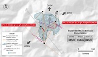 Drill hole APC-20 was drilled on the north-eastern side of the Main Breccia discovery at the Apollo target into an open area without any prior drilling and intersected a broad zone of mineralization with an abundance of gold-rich, carbonate base metal veins overprinting angular, gold-silver-copper bearing breccia. This intercept represents the highest-grade intersection over 100 metres drilled to date at Apollo with results as follows:102.20 metres @ 3.38 g/t gold equivalent and includes 33.6 metres @ 7.30 g/t gold equivalent.Drill hole APC-19 was drilled in the centre of the system in order to expand the vertical dimension in this location. The hole intercepted a broad and continuous zone of copper-silver-gold mineralization and includes a copper-rich subzone with results including:298.6 metres @ 1.54 g/t gold equivalent, including; 124.3 metres grading 0.63% copper, 0.62 g/t gold and 64 g/t silver.Based on a newly revised model of the Main Breccia system, the Company has identified two high-grade subzones of mineralization and as a result, will be drill tested in 2023 and are outlined as follows:A high-grade copper zone which daylights at surface in the southwest portion of the Main Breccia system and plunges gently to the northeast.A high-grade gold zone located in the northeastern portion of the Main Breccia system and plunges to the east. Three rigs continue to drill at Apollo with holes APC-22 through APC-27 completed and holes APC-28 through APC-30 underway. Additional assay results are anticipated in the near term.