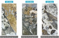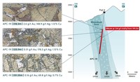 102.20 metres @ 3.38 g/t AuEq consisting of 2.72 g/t Au, 28 g/t Ag, 0.08% Cu and includes a higher-grade zone of 33.60 metres @ 7.30 g/t AuEq.Drill hole APC-19 was drilled in a southeast direction from pad 4 to a maximum depth of 582.3 metres. The hole intersected continuous copper-silver-gold mineralization from 199.20 metres (178m vertical) to 497.80 metres (470 metres vertical). The mineralized breccia contains a matrix of abundant chalcopyrite and some pyrite particularly from the beginning of the hole down to 323.50 metres which is associated with higher silver values and averaged 0.63% copper and 64 g/t silver over this interval. This newly identified shallow plunging high-grade copper zone has been intersected in six of the holes drilled to date and future drilling will target extensions of this zone within the main breccia body. Assay results for APC-19 are as follows: