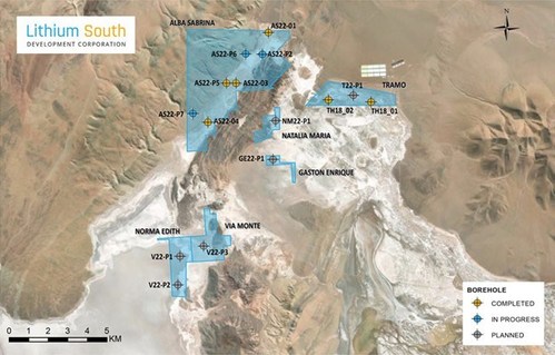 To: LoneClone who wrote (169092 ) 12/15/2022 11:22:37 AM From: LoneClone Read Replies (1) | Respond to of 193020 Lithium South Provides Further Excellent Lithium Results newswire.ca Lithium South Development Corporation Dec 13, 2022, 08:00 ET VANCOUVER, BC, Dec. 13, 2022 /CNW/ -- Lithium South Development Corporation (the "Company") (TSX-V: LIS) (OTCQB: LISMF) (Frankfurt: OGPQ) is pleased to provide results from the ongoing drill campaign at the Hombre Muerto North Lithium Project (HMN Li Project) in Salta Province, Argentina. The resource expansion drill program is comprised of four core holes (Holes AS01, AS02, AS03 and AS04) located north to south, along a channelized extension off the main salar, and three core holes (Holes AS05, AS06 and AS07) along the west side of the channel (see enclosed drill map). Two drill rigs are operating on site. Lithium South Drill Map – revised drill targets for resource expansion. The western boundary of the salar extension has now been expanded based on current results from Holes AS05 and AS06, which have encountered significant lithium brine (grade and thickness). Drilling results indicates a wider salar channel than the initial concept. Hole AS05, located approximately 800 meters west of hole AS03, has been completed to a depth of 260 meters, with a brine zone of approximately 185 meters. Eight packer samples have been acquired. Assay work is being performed at Alex Stewart Laboratories of Mendoza, Argentina, on samples acquired under the supervision of Dr. Mark King, a Qualified Person under NI 43-101. The Company is reporting results from three samples received so far from Hole ASO5: Sample HMN 139 located at the top of the hole at 35 meters, and within an alluvial fan with freshwater influence, returned 434 milligrams per liter lithium (mg/L Li). Sample HMN 140 was taken at 52 meters depth and returned 725 mg/l Li. Sample HMN 141 was taken at 66 meters depth and returned 701 mg/l Li. Hole AS06 located approximately 800 meters west of hole AS02 is encountering similar geology to hole AS05. The hole is currently at 170 meters and will be continued down to basement. Hole AS02 located in the center of the salar channel, is now at 240 meters depth. Borehole logging indicates predominantly medium-grained sand. To avoid issues with collapse of the sandy materials, sampling will be conducted at the conclusion of the hole. Site preparation work is underway to locate Hole AS07 at the southwest. Company President and Chief Executive Officer Adrian F. C. Hobkirk is quoted, "The ongoing exploration is returning consistently excellent results. Holes located to the west of the claim area are delineating the Alba Sabrina salar channel to be wider than expected, which could positively impact the expansion of the total resource at the Hombre Muerto North Lithium Project."About Lithium South The HMN Li Project is at an advanced stage of evaluation, with a Preliminary Economic Assessment completed in April 2019. Lithium South is the 100% owner of the HMN Li Project and expects to expand the known resource with its current drill program. Preliminary results support this expectation. Additional project work including permitting, environmental studies and process test work is ongoing. The Hombre Muerto North Lithium Project is adjacent to a US$4 billion lithium mine under development by the Korean multinational corporation POSCO, which acquired their holdings from Galaxy Resources Ltd. for US$280 million. Livent Corporation is producing lithium to the south of the Hombre Muerto North Lithium Project and has actively operated there for over twenty-five years.The technical and scientific information in this press release was reviewed by Dr. Mark King, a Qualified Person under National Instrument 43-101. Dr. King participated in the preparation of this news release. On behalf of the Board of Directors Adrian F. C. Hobkirk President and Chief Executive Officer Investors / Shareholders call 855-415-8100 Website: www.lithiumsouth.com Neither the TSX Venture Exchange nor its Regulation Services Provider (as that term is defined in policies of the TSX Venture Exchange) accepts responsibility for the adequacy or accuracy of this release. The TSX Venture Exchange has not reviewed the content of this news release and therefore does not accept responsibility or liability for the adequacy or accuracy of the contents of this news release. This news release contains certain "forward-looking statements" within the meaning of Section 21E of the United States Securities and Exchange Act of 1934, as amended. Except for statements of historical fact relating to the Company, certain information contained herein constitutes forward-looking statements. Forward-looking statements are based upon opinions and estimates of management at the date the statements are made and are subject to a variety of risks and uncertainties and other factors which could cause actual results to differ materially from those projected in the forward-looking statements. The reader is cautioned not to place undue reliance on forward- looking statements. We seek safe harbor. Photo - mma.prnewswire.com Logo - mma.prnewswire.com SOURCE Lithium South Development Corporation