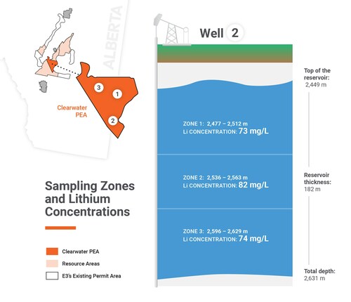 To: LoneClone who wrote (169278 ) 1/4/2023 2:15:28 PM From: LoneClone Read Replies (1) | Respond to of 192641 E3 Lithium Outlines Lithium Results from Second Well Demonstrating up to 82 mg/L newswire.ca E3 Lithium Ltd. Jan 04, 2023, 03:05 ET CALGARY, AB, Jan. 4, 2023 /CNW/ - E3 LITHIUM LTD. (TSXV: ETL ) (FSE: OW3) (OTCQX: EEMMF), Alberta's leading lithium developer and extraction technology innovator, is pleased to share that the sample results from its second well are consistent with the lithium concentrations from its first well and the historic results across the Leduc Reservoir. Figure 1: Sampling Intervals and Lithium Concentrations from E3 Lithium's Second Well (CNW Group/E3 Lithium Ltd.) The second well, located approximately 20 kilometres south of the first well in the Clearwater Project Area in the Bashaw District, was drilled in the summer of 2022. Based on brine samples retrieved from three zones, the P501 lithium concentration from E3 Lithium's (E3) second well is 74 mg/L . Please see Figure 1 for the zone intervals and concentration results. "The consistency of lithium across our reservoir as demonstrated through our first two wells is critical to the confidence in our understanding of this resource and our plans for upgrading to Measured and Indicated," said Chris Doornbos, President and CEO of E3 Lithium. "The third and final well associated with our 2022 drill program was repurposed from an existing oil and gas well; the sampling program was completed in December with concentration results anticipated soon." The brine samples were analyzed by a third-party certified laboratory, following independently verified sample acquisition procedures that maintained a strict chain of custody, in accordance with The Canadian Institute of Mining, Metallurgy and Petroleum (CIM) guidelines. Read E3's November 10, 2022 news release for the concentration results of its first well. 1 74 mg/L is the P50 result from E3 Lithium's second well. A P50 estimate indicates there is a 50% probability that quantities recovered will equal or exceed the P50 value. About E3 Lithium E3 Lithium is a development company with total of 24.3 million tonnes of lithium carbonate equivalent (LCE) inferred mineral resources1 in Alberta. As outlined in E3's Preliminary Economic Assessment, the Clearwater Lithium Project has an NPV8% of USD 1.1 Billion with a 32% IRR pre-tax and USD 820 Million with a 27% IRR after-tax1. Through the successful scale up its DLE technology towards commercialization, E3 Lithium's goal is to produce high purity, battery grade lithium products. With a significant lithium resource and innovative technology solutions, E3 Lithium has the potential to deliver lithium to market from one of the best jurisdictions in the world. ON BEHALF OF THE BOARD OF DIRECTORS Chris Doornbos, President & CEO E3 Lithium Ltd. 1: The Preliminary Economic Assessment (PEA) for the Clearwater Lithium Project NI 43-101 technical report is effective Sept 17, 2021. The mineral resource NI 43-101 Technical Report for the North Rocky Property, effective October 27, 2017, identified 0.9Mt LCE (inferred). The mineral resource NI 43-101 Technical Report for the Bashaw District Project, effective July 11, 2022, identified 23.4Mt LCE (inferred). All reports are available on the E3 Lithium's website (e3lithium.ca/technical-reports) and SEDAR ( www.sedar.com ). Forward-Looking and Cautionary Statements This news release includes certain forward-looking statements as well as management's objectives, strategies, beliefs and intentions. Forward looking statements are frequently identified by such words as "may", "will", "plan", "expect", "anticipate", "estimate", "intend" and similar words referring to future events and results. Forward-looking statements are based on the current opinions and expectations of management. All forward-looking information is inherently uncertain and subject to a variety of assumptions, risks and uncertainties, including the speculative nature of mineral exploration and development, fluctuating commodity prices, the effectiveness and feasibility of emerging lithium extraction technologies which have not yet been tested or proven on a commercial scale or on the Company's brine, competitive risks and the availability of financing, as described in more detail in our recent securities filings available at www.sedar.com . Actual events or results may differ materially from those projected in the forward-looking statements and we caution against placing undue reliance thereon. We assume no obligation to revise or update these forward-looking statements except as required by applicable law. Neither the TSX Venture Exchange nor its Regulation Services Provider (as that term is defined in the policies of the TSX Venture Exchange) accepts responsibility for the adequacy or accuracy of this release. SOURCE E3 Lithium Ltd. For further information: E3 Lithium - Investor and Media Relations; Robin Boschman, Director, External Relations, investor@e3lithium.ca, 587-324-2775