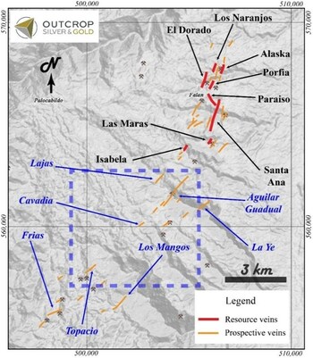 VANCOUVER, BC, Jan. 3, 2023 /CNW/ - Outcrop Silver & Gold Corporation (TSXV: OCG) (OTCQX: OCGSF) (DE: MRG1) ("Outcrop") is pleased to provide an update on its regional exploration and target generation program on its 100% owned Santa Ana high-grade silver project in Colombia. Outcrop continues to generate and advance new vein targets through its regional generation program along the 8.5 kilometre structural corridor in the central sector of the Santa Ana project (Map 1) between the current drilling to the north and the Frias mine to the southwest.