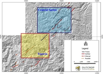 Outcrop now has a total of nine priority targets ready to drill in this area. Several more areas are being advanced as targets through further detailed work. Over 18 kilometres of potential vein zones have been identified, each consisting of multiple veins within an area 2 to 3 kilometres wide.