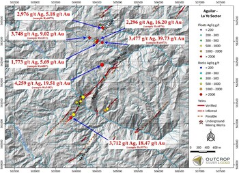 • Up to 19.51 and 18.47 grams gold per tonne and 4,259 and 3,712 grams silver per tonne from additional samples from the Aguilar vein.