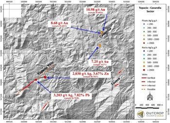 Map 4. Detailed Sampling Topacio-Cavadia targets from samples in this release. (CNW Group/Outcrop Silver & Gold Corporation)