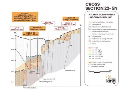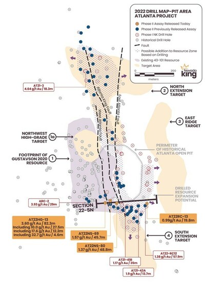 • Cal Herron, Exploration Manager of Nevada King, stated, "This latest group of holes, together with the four holes released last week along Section 22-6N, provide us with a much more complete picture of the Atlanta Mine Fault Zone's internal structure and of the controls on the gold mineralization. AT22HG-13 is a very important hole since it not only pegs the location of the AWF, which is rapidly shaping up as the main gold control at Atlanta, but with a core intercept of 3m averaging 37.45 g/t Au (1.2 oz/t) we now see potential for finding multi-ounce gold mineralization. Nevada King's high-grade intercept also validates several historical drill holes that reported intervals exceeding 32g/t Au, so we now have several other locations within the resource zone in which to intiate a search for high-grade mineralization. Our exploration strategy will be the same – step out gradually to define geometry, then follow the interpreted trend. We have a great starting point on the AWF with AT22HG-13, and now we'll simply follow the high-grade mineralization 700m northward to the Company's 2021 high-grade hit in AT21-3 within the North Extension Target. This same high-grade potential may possibly extend southward as well, but additional drilling is needed to test this. It is important to remember that the AWF more or less bisects the Gustavson 2020 resource zone, so establishing a cohesive, higher-grade corridor through the middle of this resource zone should have a strong impact on future resource evaluations.