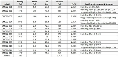 Successful completion of 12 hole maiden diamond drilling program (506m) confirming at- or near-surface mineralization with a total of 324.5 meters of mineralization and an average weighted grade of 2.12% Cg.All the holes have significant intervals with grades typically ranging from 1.5% to 4.5% Cg and consistent mineralized zones.All information and data will be compiled and used to complete the maiden NI 43-101 resource estimate planned for Q1 2023.