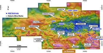 VANCOUVER, BC, Jan. 17, 2023 /CNW/ - Pan Global Resources Inc. ("Pan Global" or the "Company") (TSXV: PGZ) (OTC: PGNRF) is pleased to announce assay results for 21 drill holes targeting volcanogenic massive sulphide (VMS) copper and polymetallic mineralization at the 100%-owned Escacena Project in the Iberian Pyrite Belt (IPB), southern Spain. The drill holes were all completed in 2022 and provide the first tests of the Zarcita, Hornitos, La Jarosa, Pilar and Bravo Norte targets. Pan Global's 2023 exploration program in Spain includes a 20,000m multi-target drill program with an estimated budget of CAD $8.5 million.