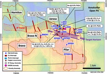 Figure 4 – La Jarosa, Pilar, Bravo Norte Targets, target horizon, IP anomaly trend and drill hole locations (Aznalcóllar open pit 2km northeast of La Jarosa) (CNW Group/Pan Global Resources Inc.)