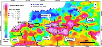 Figure 5 – The Hornitos Target area Pb Zn Soil geochemistry, IP and gravity anomalies and drillhole locations (CNW Group/Pan Global Resources Inc.)