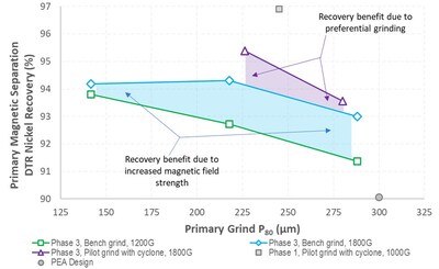 For the approximately 40% of DTR nickel which was sufficiently ground to report to hydrocyclone overflow, the DTR nickel recovery in cleaner magnetic separation exceeded 99%, in line with the 100% stage recovery assumption in the 2020 PEA. The remaining DTR nickel recovered in the regrind circuit clean-out was batch ground and then subjected to magnetic separation, where DTR nickel recovery also exceeded 99%.
