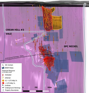 • Preliminary modelling of historic drill intersections suggests that the mineralized zone hosted on the Crean Hill 3 Property extends from the SPC-Vale property boundary to the west for over 600 metres.