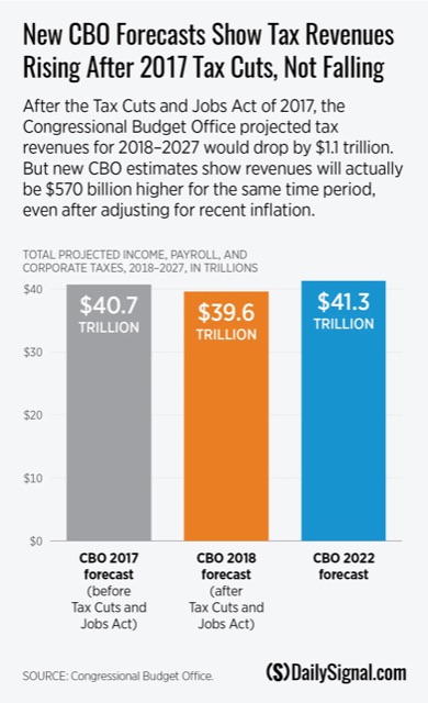 The Numbers Are In: Trump’s Tax Cuts Paid Off.. Projected to reduce the nat’l debt by $1 Trillion. The Congressional Budget Office’s May 2022 forecast shows that the government now expects to bring in more tax revenue in the decade following the 2017 “Trump tax cuts” than it had projected prior to the December 2017 passage of tax reform.
