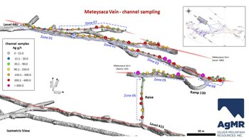 Geochemical assays have been received for 436 rock channel samples taken from Level 480 of the Meteysaca Vein and adjacent workings, including a ramp and a raise that connect to the haulage level 415 located approximately 67 m below (Fig.1). This zone of well-developed mineralization in the Meteysaca Vein is exposed over approximately 148 m horizontally and additionally 30 m along the subvertical raise.