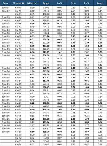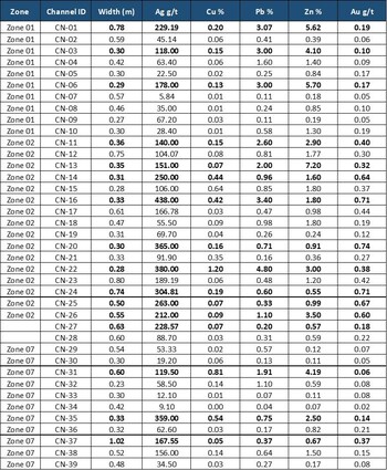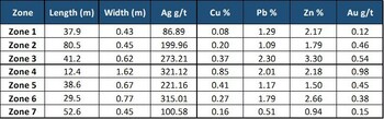 0.95m @ 535.26 g/t Ag, 6.43% Pb, 6.26% Zn, 1.37% Cu, and 0.58 g/t Au0.90m @ 721.27 g/t Ag, 1.91% Pb, 2.62% Zn, 1.42% Cu, and 0.98 g/t Au1.90m @ 313.06 g/t Ag, 2.51% Pb, 2.47% Zn, 0.76% Cu, and 1.37 g/t Au0.63m @ 873.82 g/t Ag, 2.50% Pb, 3.23% Zn, 2.09% Cu, and 0.13 g/t Au