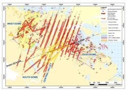 HOLE DCAR0096 DRILL RESULTS Hole DCAr0096 stepped out 60 m from hole DCAr0044 towards the northeast at the East Dome (Figures 1 & 2) and was drilled to the southwest at a 252-degree azimuth. As reported on August 8, 2022, hole DCAr0044 intercepted 515 m (from 266 m to 781 m) grading 1.10 g/t Au and 6 g/t Ag, including 88 m grading 2.57 g/t Au, 9 g/t Ag and 0.12% Cu (Figure 2).