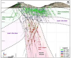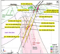 METAL ZONING AND MINERALIZATION MODEL Assay results of Ag, Pb, Zn, Au and Cu are plotted for drill holes within a slice thickness of 400 m (+/- 200m) along cross section of hole DCAr0096, as shown in Figure 4 below. The assay results show apparent metal zoning: 1) gold-copper mineralization occurs at the centre related to rhyolite intrusions; 2) surrounded by a lower temperature polymetallic lead-zinc zone; and 3) a thick silver (plus lead and zinc) zone near surface.