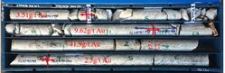 The most interesting finding from this hole is that high grade gold intervals occur in rhyolites with disseminated pyrite preferentially along flow-banded textures, as shown in drill core (Figure 3). In addition, high gold assay grades also occur along the contacts of rhyolites with strongly altered volcanoclastic rocks, implying that gold mineralization is related to the rhyolite intrusion. The mineralized rhyolites in hole DCAr0096 are likely part of a feeder zone to the northeast whereas previously, gold mineralization was thought to have extended to the south at depth.