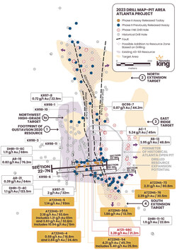 VANCOUVER, BC, Feb. 27, 2023 /CNW/ - Nevada King Gold Corp. (TSXV: NKG) (OTCQX: NKGFF) ("Nevada King" or the "Company") is pleased to announce assay results from six reverse circulation ("RC") holes and one core hole recently completed at its Atlanta Gold Mine Project located 264km northeast of Las Vegas, Nevada, in the prolific Battle Mountain Trend. These holes plotted along Section 22-7N were drilled across the high-grade feeder zone associated with several strands of a braided network of structures comprising the Atlanta Mine Fault Zone ("AMFZ").