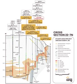 Highlights: Figure 1. Location map for holes reported in this news release along drill section22-7N relative to the perimeter of the historical Atlanta Pit and footprint of the Gustavson 2020 NI 43-101 resource. Shallow drillholes on the mine dumps have been removed from the plot for clarity. (CNW Group/Nevada King Gold Corp.) Figure 2. Cross section 22-7N looking north across the southern portion of the Atlanta Mine Fault Zone. Shallow intrusive activity and closely associated gold mineralization are localized within the volcanic and sedimentary sequence along the western side of the West Altanta Fault. Higher grade mineralization is concentrated within narrow fault blocks formed between the East Atlanta and Atlanta King Faults and along the West Atlanta Fault. (CNW Group/Nevada King Gold Corp.) Hole No