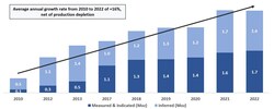 • Proven and probable mineral reserves of 755.2 thousand ounces (koz) of gold (Au) from 2.4 million tonnes (Mt) at 9.95 grams per tonne (g/t) Au. This compares to 744.7 koz from 2.3 Mt at 10.1 g/t Au as of December 31, 2021