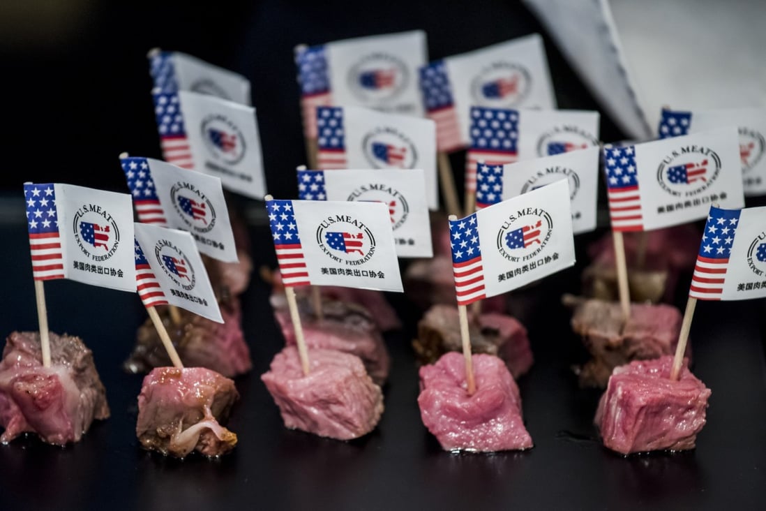 US flags and branding are seen on samples of America beef in Beijing. Photo: AFP