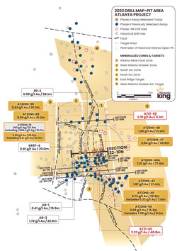 • Today's holes on Section 22-10N were drilled across the 150m-wide high-grade feeder zone comprising the Atlanta Mine Fault Zone ("AMFZ"), which lies between the East Atlanta and West Atlanta Faults (see Figure 1). These vertical holes continue to advance northward the high-grade gold mineralization concentrated along a series of sub-parallel, fault-bounded graben blocks previously identified and reported to the south in Sections 22-5N through 22-9N.