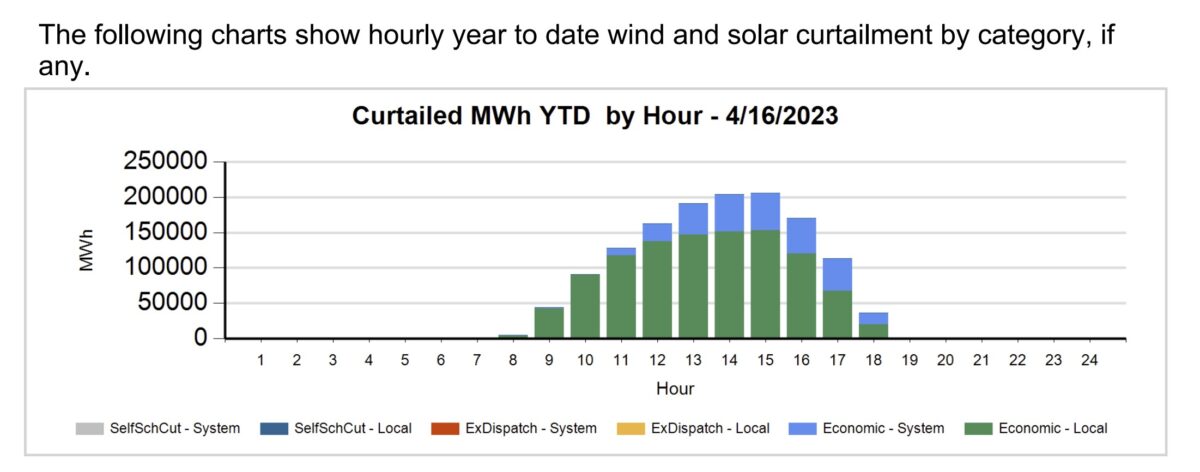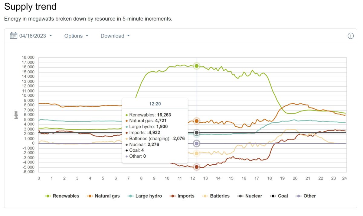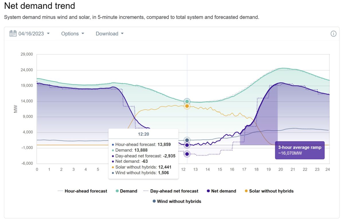 Respond to of 1578739 Driven by solar, California’s net demand hit zero on Sunday The CAISO region’s spring solar record setting season is upon as, with solar peaking at greater than 95% of the state’s demand. April 20, 2023 John Fitzgerald Weaver Markets Markets & Policy California Image: Recurrent Energy Share On Sunday, California’s CAISO region reported that its electricity “net demand” bounced near zero for chunks of the afternoon. The power grid operator defines net load as total electricity demand minus wind and solar power. Starting at 12:20 PST, CAISO first reported net demand at negative 63 MW. At the moment, total grid demand was 13.8 GW. It was offset by 12.4 GW of utility managed solar, and 1.5 GW of wind. While CAISO’s demand was noted as being nearly 14 GW, total true demand was above 20 GW at the moment when taking into account the greater than 10 GW of behind-the-meter solar power deployed in the power grid region. Combined, solar was meeting greater than 90% of California’s electricity needs at the moment. At the same time that CAISO first noted a net demand below zero, at 12:20 p.m., the overall supply picture was much more complex. First, there was greater than 4.7 GW of natural gas running, as well as electricity exports of over 4.9 GW. According to Grid Status ’ Max Kanter, Sunday set a record for the highest electricity export ever from CAISO. In addition to the gas and 4 MW of coal burning somewhere in the state, batteries and multiple other clean sources were doing their job. Just over 2 GW of batteries were being charged, along with just over 4 GW of combined nuclear and hydroelectric power were pumping. In fact, starting at 8:10 a.m. and going until 5:50 p.m. – nine hours and forty minutes – CAISO’s total electricity demand could be covered by its clean resources of nuclear, hydro, wind and solar. CAISO’s curtailment report from Sunday shows that there was some solar power being shut down during the day. The report noted that during the noon hour, when the state officially broke below zero on net load by 0.063 GW, solar curtailment capacity peaked at just over 1.7 GW, with 1.54 GWh of electricity not being generated. On April 18, 2023 solar peaked at greater than 14 GW. pv-magazine-usa.com
