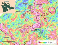 To date, six zones of porphyry-related mineralization (Megabuck, Deerhorn, Takom, Three Firs, Southeast, Megaton) have been identified at the Woodjam Project by drilling (95,092 metres in 281 holes since 2009 and a further 114 holes, 30,092 metres predominantly from 1998). These six mineralized zones form a cluster approximately 5 kilometres in diameter.