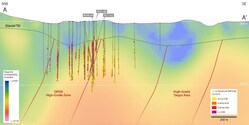 | Source: "NI 43-101 Technical Report for Woodjam Property, Horsefly, British Columbia, Canada", prepared by Susan Lomas, P.Geo. of Lions Gate Geological Consulting inc. (LGGC). and issued on December 16, 2022. The historical mineral resource estimate was prepared for Goldfields and Consolidated Woodjam Copper with an effective date of May 30, 2013. The NSR calculation used US$1,650/oz Au, US$3.90/lb Cu and recoveries of 56% Au and 64% Cu. The Southeast Historical Estimate was reported within a resource limiting pit shell based on a price assumption of US$1,650/oz Au and US$3.90/lb Cu.