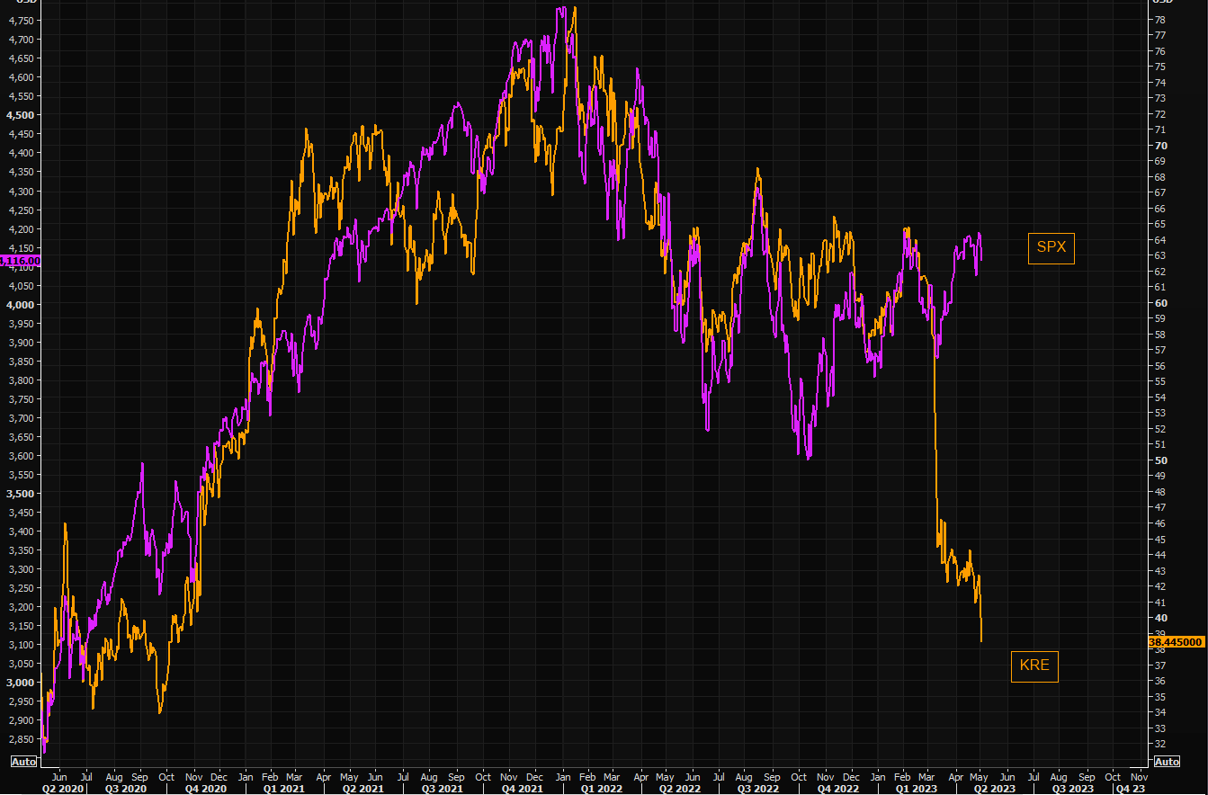 It is hard to find superlatives for the latest move in KRE. This is a pure panic move. Second chart shows KRE vs SPX: We don't think this gap will close, but it sure looks scary...