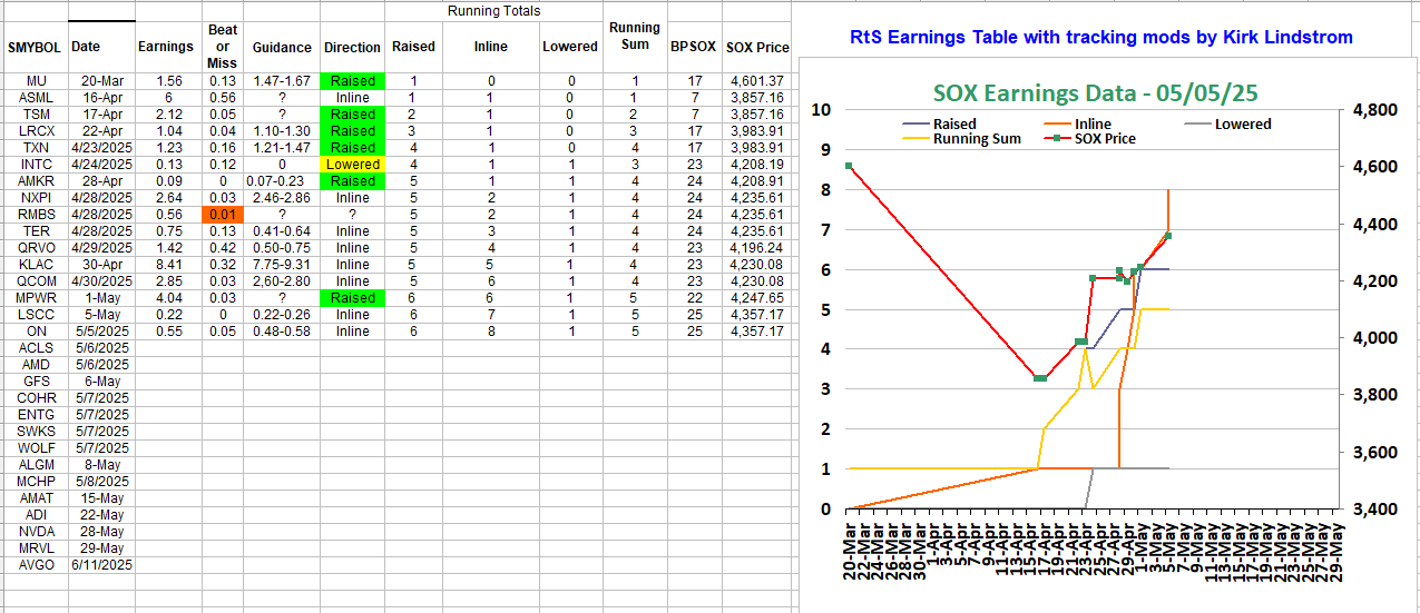 SOX Components Earnings' Table Update - Now Including the Beat by ON but slowing revenues and Inline Guidance. ON fell almost 9% today. LSCC merely met expectations and it is falling slightly after hours on Inline Guidance: