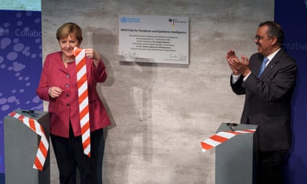 Angela Merkel and the World Health Organization’s Tedros Adhanom Ghebreyesus cut the ribbon at the opening of the WHO Hub For Pandemic And Epidemic Intelligence, 2021 Photograph: Michael Sohn/AFP/Getty Images