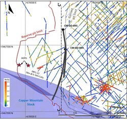 Drill holes CM-DD-894 and CM-DD-895 (Target area 4 on Figure 1) were drilled 160 metres apart to test a strong IP chargeability feature (on the most westerly line from the 2007 IP/DC resistivity survey) located immediately north of the Copper Mountain Stock ("CMS") and on trend to the northwest from the current mining area in the Copper Mountain main pit shown in Figure 1. Appendix B, Figure 3 shows a location map and Figure 4 shows a cross section with drill holes CM-DD-894 and CM-DD-895. The highest-grade intervals occur within zones of porphyry-related hydrothermal breccia, including a 42-metre zone grading 0.74% CuEq from 480 metres depth in hole CM-DD-895.