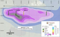 Four drillholes were completed during the winter of 2023. Hole MID23-01, which entered mineralized dunite after 2 metres of overburden, intersected 0.28% nickel over 343 metres with the hole ending in mineralized dunite (see Table 1 and Figure 2). The first two holes (MID23-01 and MID23-02) were sent for QEMSCAN that showed awaruite to be the dominant nickel-bearing mineral (April 13, 2023, release). Assays for the remaining holes are pending.