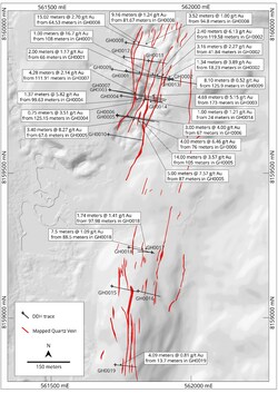 • 6.46 g/t gold over 4.0 m (including 12.73 g/t gold over 2.00 m) from 76.00 m in GH0006