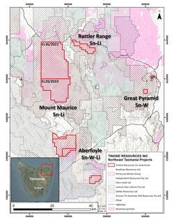 VANCOUVER, BC, July 11, 2023 /CNW/ - TinOne Resources Inc. (TSXV: TORC) (OTCQB: TORCF) (Frankfurt: 57Z0) ("TinOne" or the "Company") is pleased to announce that it been granted a total of 243 km2 of new exploration tenure in northeast Tasmania. In addition, the Company has applied for another 133 km2, which has been recommended to be granted in the coming months. The road-accessible tenements, collectively called the Mount Maurice Project, are considered prospective for tin and lithium mineralization. While northeast Tasmania has historically been a tin and tungsten producing region, recent exploration by several companies surrounding TinOne's tenements have focussed efforts on lithium prospectivity.
