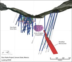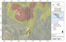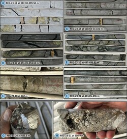 Discussion and Interpretation of Results The targeted breccia is now intersected by 9 holes (2022-2023) covering an area of ~130m of strike and ~100m of dip extent. The zone is open along strike and at depth as well as up-dip to the most eastern and westernmost extents. The breccia appears to be widening with depth. Figure 3 shows the current interpreted breccia zone as defined by the current drilling. With the new intersection points and subsequent modelling, the breccia is cutting stratigraphy slightly. The body strikes NW-SE and dips to the NE. Current projections of the zone appear as though it may be related to up-dip Au mineralization discovered by Regency in 2022 to the East of the historic Dios Padre silver mine. Drilling orientation will be modified slightly in phase 2 in order to cut the body more perpendicular and reduce drill meters required per hole. Mineralization within the breccia follows a similar pattern observed in holes REG-23-01, REG-23-14 and REG-23-15. The shallower intersections are more pyrite dominant with deeper intersections containing more specularite. Chalcopyrite appears to be highest in abundance where the breccia is proximal to the lower contact of the quartz-feldspar porphyry (QFP). Matrix abundance can be highly variable through the breccia zones, ranging from 10-15% to upwards of 50% matrix where clasts are surrounded and supported by a sulphide-specularite matrix. Texturally, shingle, and collapse type breccia textures are observed locally within the intervals. It is becoming evident that mineralization at Dios Padre is long lived and multi-stage in nature with separate gold, copper and silver events overprinting each other as part of a protracted magmatic-hydrothermal mineralizing system. Peripheral alunite, specularite and siderite alteration is significantly more widespread than was recognized earlier as current drilling is 100% within the broad alteration halo of the system. "We are very pleased with the results from phase 1 of 2023 drilling. The more we explore this property the more indications we find of a large, long lived magmatic-hydrothermal Au-Cu-Ag system with multiple overprinting events. This project is in its infancy and we are only beginning to realize what its potential might be." – Michael Tucker – Director and Lead Geologist. Collar and location information for the phase 1 2023 drill program. Table 2 : Collar Location data for phase 1 2023 drill holes. Coordinates are in WGS84, UTM zone 12N Hole ID Azimuth (°) Dip (°) Final Depth (m) Easting (m) Northing (m) Elevation (m) REG-23-13 180 -59.5 670.05 690450 3150917 1303 REG-23-14 179.5 -60.2 686.4 690450 3151016 1292 REG-23-15 179.6 -66.5 620.5 690450 3151017 1292 REG-23-16 180 -65 620.5 690417 3151031 1280 REG-23-17 178 -58.2 575.4 690400 3150991 1281 REG-23-18 178 -70.6 550.9 690400 3150991 1281 REG-23-19 178 -62 599.2 690502 3150998 1299 REG-23-20 178 -67.5 666 690502 3150998 1299 REG-23-21 179.9 -58.9 651.3 690502 3150998 1299 REG-23-22 172.3 -51.1 536.3 690257 3150925 1234