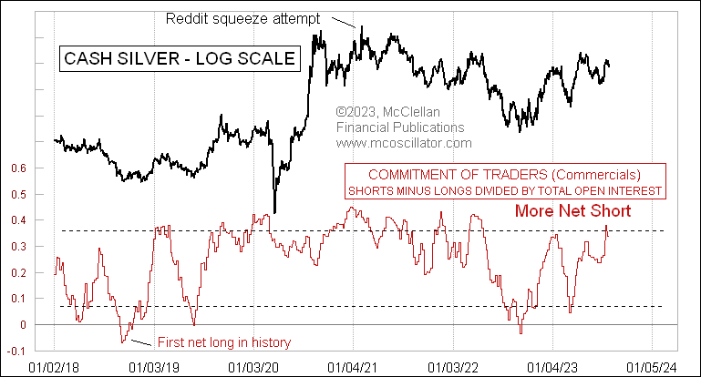 Commercial traders of silver futures are back up to a big net short position as a group, a condition pretty reliably associated with price tops. Worth nothing that they have almost never been net long as a group, as many of these traders are silver producers selling forward. The message here is that these smart-money traders think that this price is a good one to lock in.