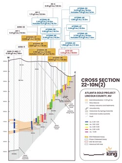 Figure 1. Location map for holes reported in this news release along drill section22-010N relative to the perimeter of the historical Atlanta Pit and footprint of the Gustavson 2020 NI 43-101 resource. Shallow drillholes on the mine dumps have been removed from the plot for clarity. (CNW Group/Nevada King Gold Corp.) Figure 2. Cross section 22-10N(2) looking north across the southern portion of the Atlanta Mine Fault Zone. Higher grade mineralization is concentrated within narrow fault blocks formed between the East Atlanta and Nevada King Fault and along the western side of the West Atlanta Fault. (CNW Group/Nevada King Gold Corp.) Hole No.