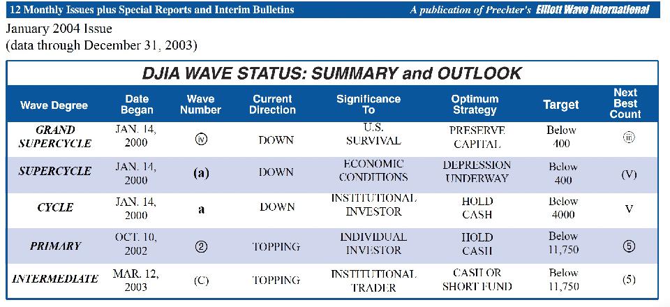 This is what Prechter published on January 1, 2004. He Projecting Dow Grand Supercyle (IV) at 400.