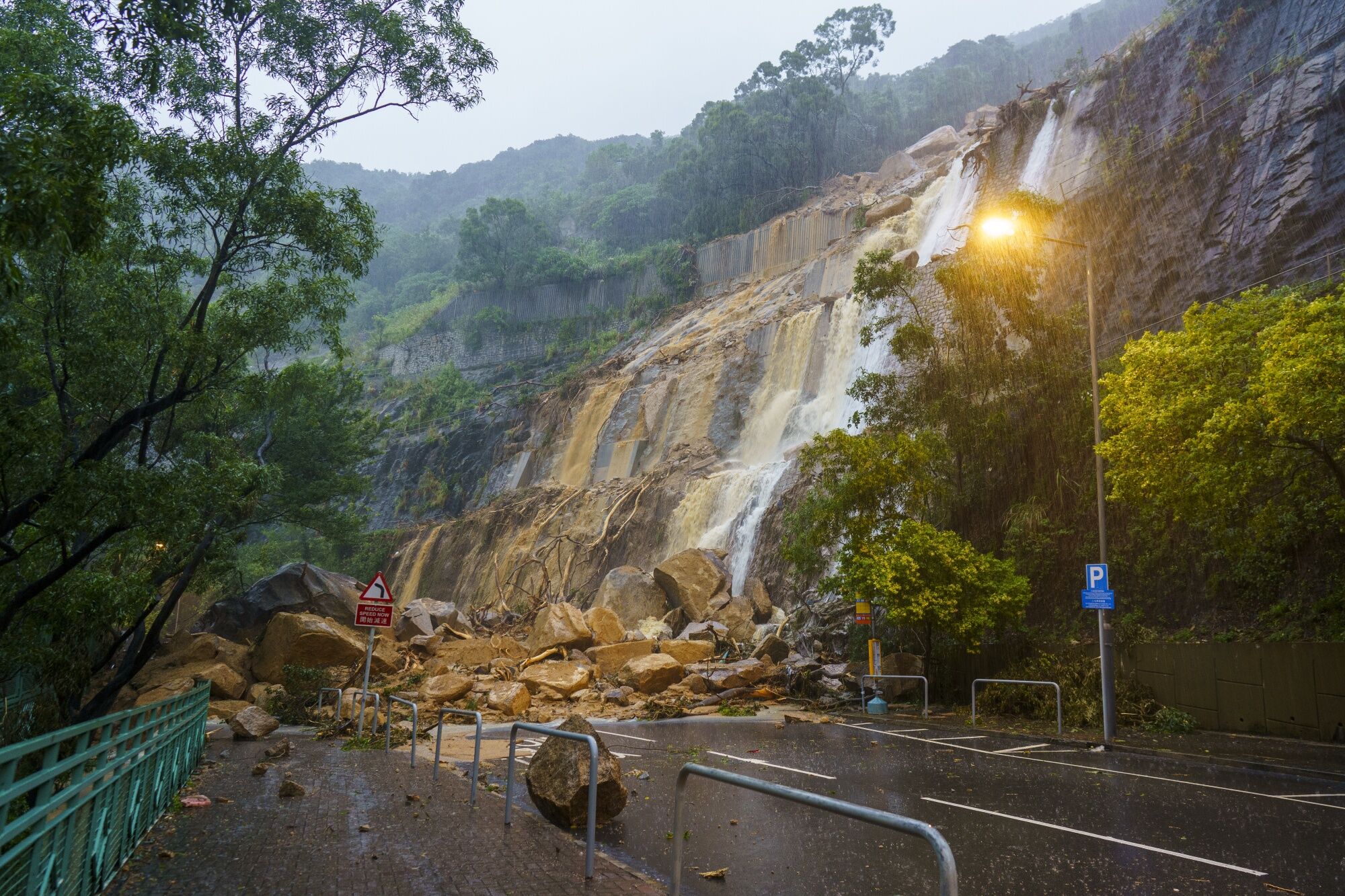 The city’s leader John Lee told government departments to respond with all-out efforts to deal with the “severe” flooding in most parts of the finance hub. The lack of forewarning contrasted with the approach of Super Typhoon Saola, when the city’s chief secretary held a press conference flanked by department heads to address potential risks. In Pictures: ‘Black Friday’ Rainstorm Batters Hong Kong In the village of Stanley on the south side of Hong Kong island, rivers of water ripped open pavements to expose underground cables. A damaged minibus was abandoned in the middle of a waterfront road, surrounded by debris. Floods had carved channels in the nearby beach, carrying sand into the sea. Nearby, part of a hillside had fallen on to the road to Tai Tam. There were seven landslides recorded as of 8 a.m., six of which were on Hong Kong island. Rain is expected to ease off gradually this afternoon, an observatory spokesperson said, adding there is no timetable for the black rainstorm warning to be lifted. A landslide on Hong Kong Island.Photographer: Justin Chin/Bloomberg Saola Departs Hong Kong After Bringing Destructive Winds Before the rains hit, the city was still cleaning up from Saola, which forced Hong Kong to shut down on Friday and Saturday last week. That storm, the strongest to hit Hong Kong since Mangkhut in 2018, toppled trees and blocked roads. It was only the sixth time in the past four decades that the observatory raised its highest storm warning. The storms are the latest examples of extreme weather experienced around the world this summer. In late July and August, dozens of people died in northern areas of China including Beijing due to flooding from a typhoon.