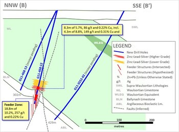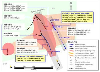 G11-468-12 (-75° dip, 330° azimuth, 323m depth), an 80m step-out to the east (along strike) from G11-468-06, intersected two significant zones of mineralization: (i) 10.5m of 14.7% Zn+Pb (5.8% Zn and 8.9% Pb), 399 g/t Ag and 0.31% Cu, in a broader interval of 18.8m of 10.2% Zn+Pb (3.9% Zn and 6.3% Pb), 257 g/t Ag and 0.22% Cu (true width unknown), interpreted to be an important steeply-dipping and likely vertically extensive feeder zone below the Waulsortian limestone; and (ii) 4.3m of 8.8% Zn+Pb (5.6% Zn and 3.2% Pb), 149 g/t Ag and 0.31% Cu, in a broader interval of 8.3m of 5.7% Zn+Pb (3.7% Zn and 1.9% Pb), 86 g/t Ag and 0.17% Cu (true width is 90-100% of reported interval), approximately at the base of the Waulsortian limestone (see Exhibit 1, 2 and 3).