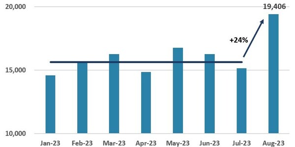 VANCOUVER, BC, Sept. 11, 2023 /CNW/ - Aris Mining Corporation (Aris Mining or the Company) (TSX: ARIS) (OTCQX: TPRFF) announces record gold production of 19,406 ounces at its Segovia Operations in Colombia during August 2023, the highest monthly production since the expansion of the Maria Dama processing plant in 2022. This is a result of our efforts in optimization and improvement and represents a 24% increase over the average gold production rate for the initial seven months of 2023.