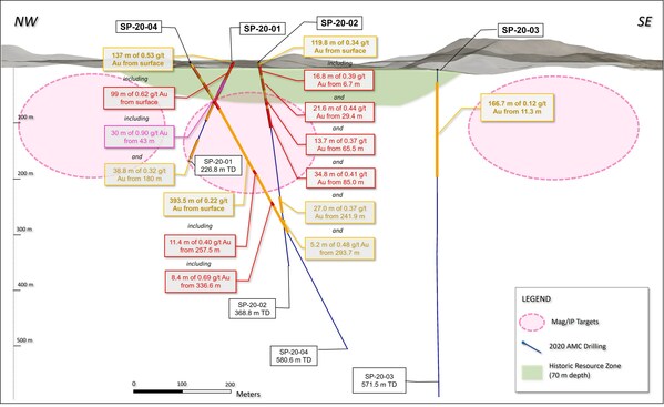 Figure 1. Sugarloaf Peak Gold Project long section showing historic estimate* outline to depth of 70 metres, as well as geophysical drill targets at depth on strike. (CNW Group/Arizona Metals Corp.)