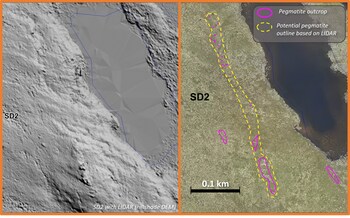 Inferred extent of the SD2 Pegmatite based on Lidar image, LDG Project, NWT (CNW Group/North Arrow Minerals Inc.)