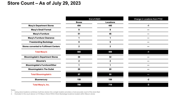 Macy's lists 719 store locations as of July 29, down slightly from the 726 listed at the end of 2021. The company owns the majority of these locations, especially the Macy's and Bloomingdale's locations, in high-quality A malls.