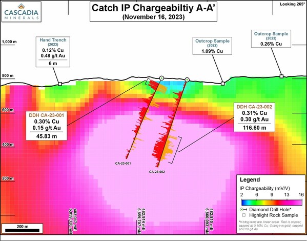 VANCOUVER, BC, Nov. 16, 2023 /CNW/ - Cascadia Minerals Ltd. ("Cascadia") (TSXV: CAM) is very pleased to provide results of the first two diamond drill holes ever completed at its 100%-controlled flagship Catch Property in central Yukon, Canada, located 16 km from an all-season highway and powerline within the traditional territory of the Little Salmon Carmacks First Nation. The Catch Property hosts multiple new greenfield discoveries of copper-gold porphyry mineralization within the northern extension of the prolific Stikine Terrane from BC's Golden Triangle. A total of five holes were drilled at Catch in 2023, totalling 2,462 m. This release contains results from the first two holes (1,066 m), with results from the remaining three holes pending.