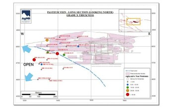 Figure 3 Pasteur Vein longitudinal Section showing grade thickness values - AgEq values are calculated using parameters described for Table 1 (CNW Group/Silver Mountain Resources Inc.)